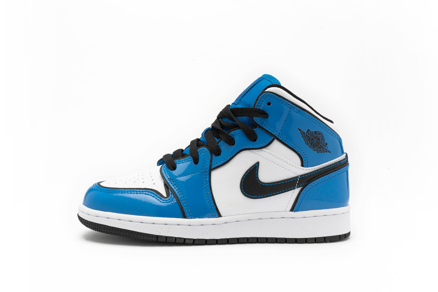 The Air Jordan 1 Mid Signal Blue (GS) is a shoe designed for grade schoolers (GS). This colorway boasts white underlays contrasted by shiny blue overlays surrounded by black trims