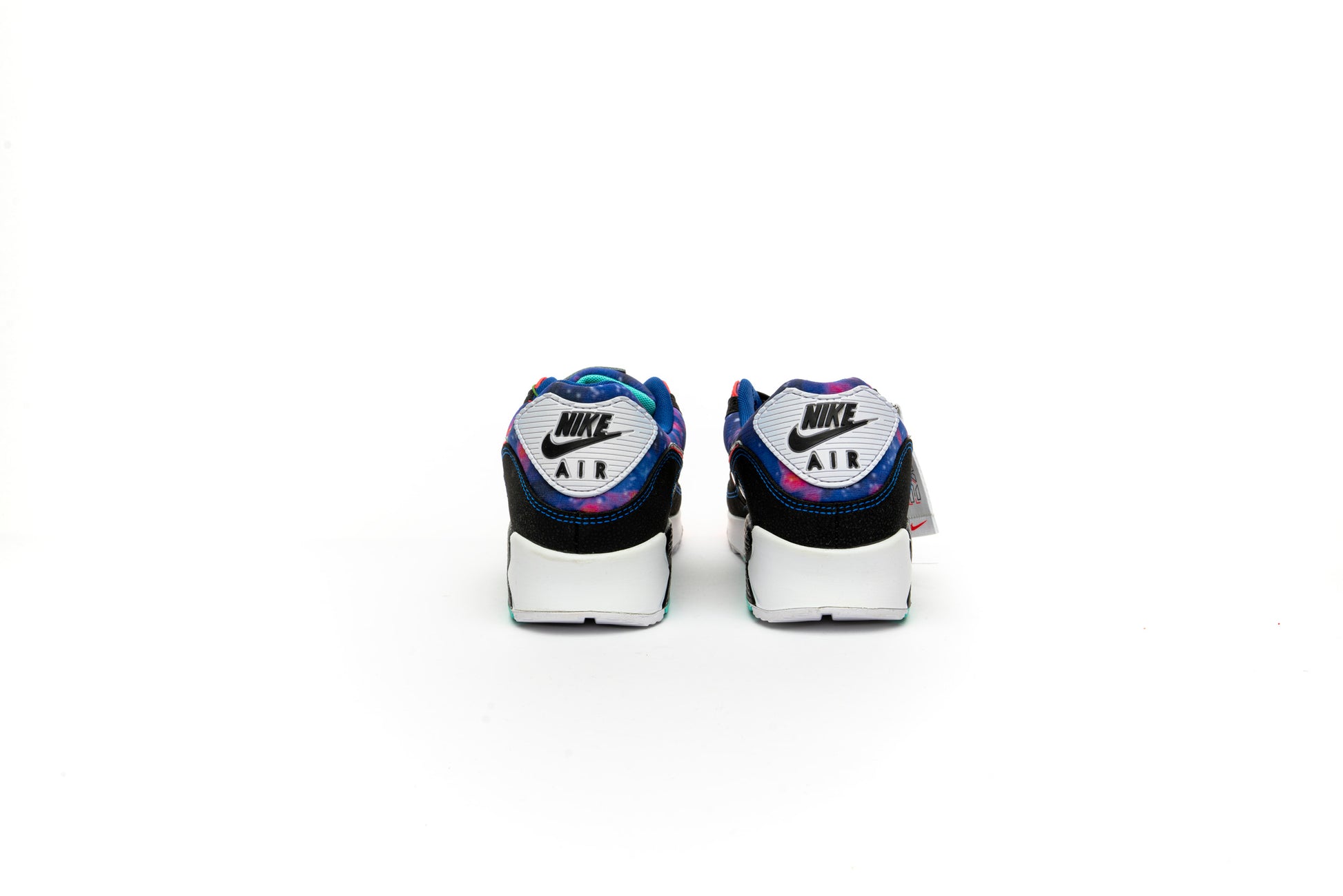 The Nike Air Max 90 Supernova (2020) features a black, white, and multicolored leather and textile uppers, with the soft underlays sporting a galaxy-like print that includes bursts of blue, black, red, pink, and white